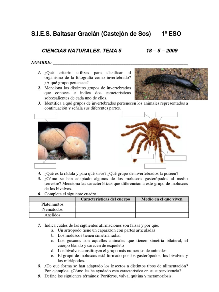 Examen Ciencias Naturales 1o Eso Tema 5 Moluscos Invertebrado